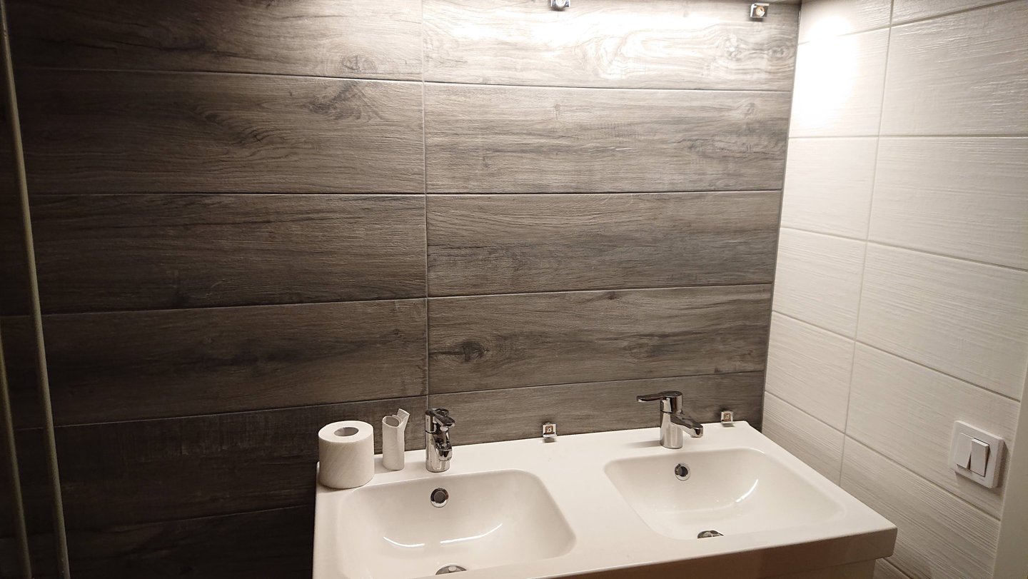 This bathroom combines functionality and style with its modern and elegant design. The light gray tiles give the space a bright and airy feel, while wood-effect flooring adds warmth and texture. A unique glass shower divider etched with artistic designs serves as both a focal point and a splash guard for the sleek, stone basin that rests atop a white vanity with storage. Above the vanity, a large mirror with integrated lighting enhances the sense of space and provides excellent illumination.