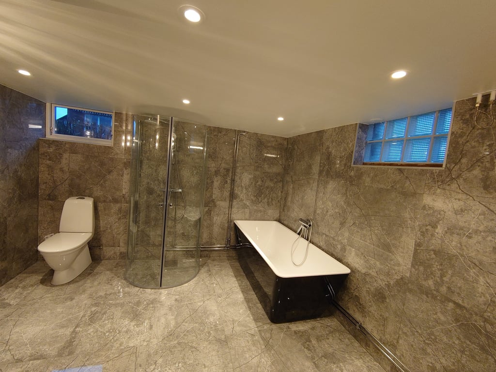 Indulge in our luxurious bathroom design, where marble elegance meets modern comfort. The sleek glass shower and standalone tub create a spa-like sanctuary, illuminated by soft, recessed lighting for a tranquil retreat right at home.